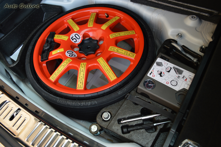▲18吋備胎平時為消氣狀態,必須利用附贈的電動打氣機才可使用。
