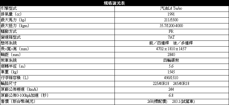 然而因為本車配置的是跑車化懸吊,在崎嶇路面行駛底盤會明顯傳來悶哼聲,震動也稍微明顯,但這樣的特性遇到高速奔馳的場合,沉穩的懸吊反應反倒讓過彎更安心,避震阻尼能夠有效抵擋回彈力道,車身反應容易掌握,這大概就是所謂的「舒適型運動調校」。