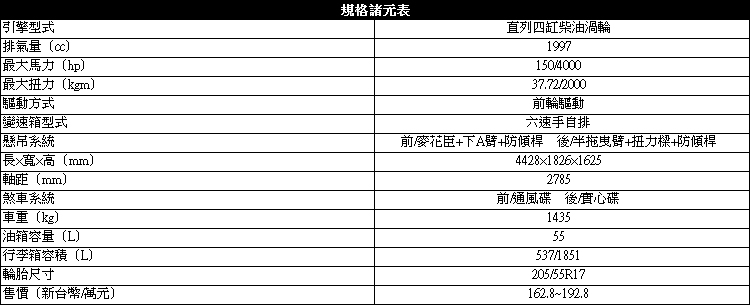 值得一提的是在遇到下坡路段時,所搭配的Tiptronic六速手自排變速系統會hold在低速檔位保持檔煞效果,不像許多日系國產車在無煞車、油門操作,車速也無明確減緩跡象時換檔程式會判定進檔以降低轉速,後者雖然降低了油耗,但從安全角度來看自然是前者較好。變速系統對路況的良好對應能力,也彌補了些柴油引擎本身在動力收放彈性不如汽油引擎的先天弱勢。23.26km/l的平均油耗實力則是你在悠遊駕馭之餘另一個會開心的地方。