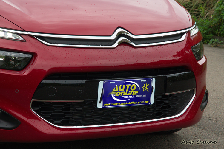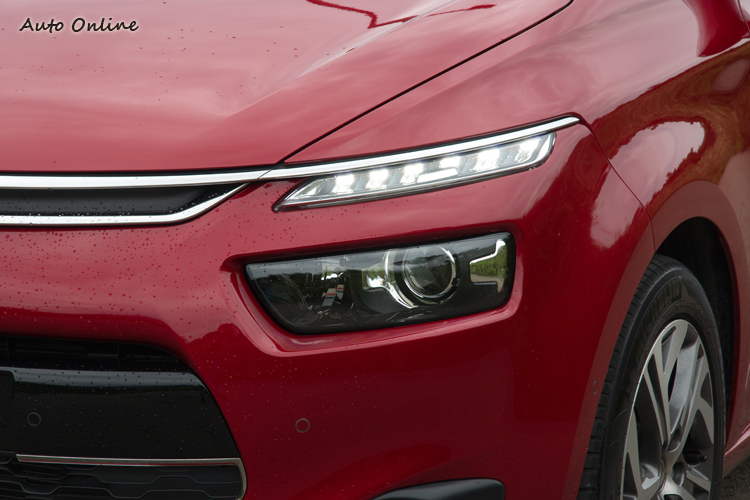 C4 Picasso車頭顯得圓潤飽滿,但是上面頭燈、LED日間行車燈與廠徽都是纖細的長條設計,加上引擎蓋兩側的折線點綴,產生一種對比性的美感。