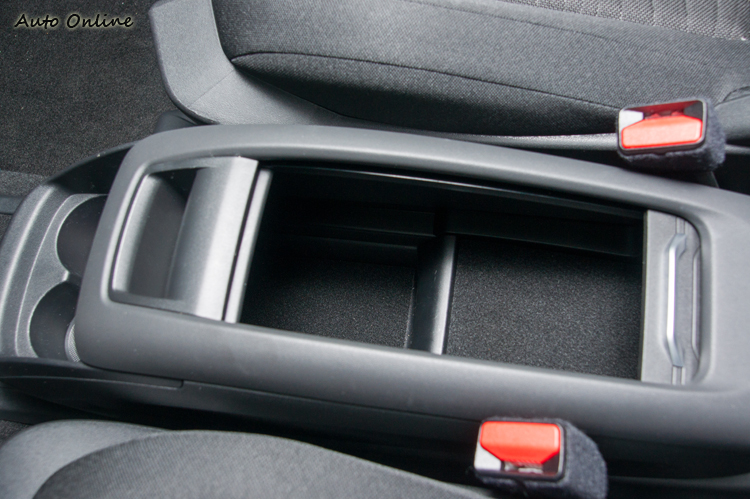 前座中央的置物盒空間較大,可放不少隨身物品,甚至可以整個拆掉空出中央通道空間來方便放置一些大型或長形物品;