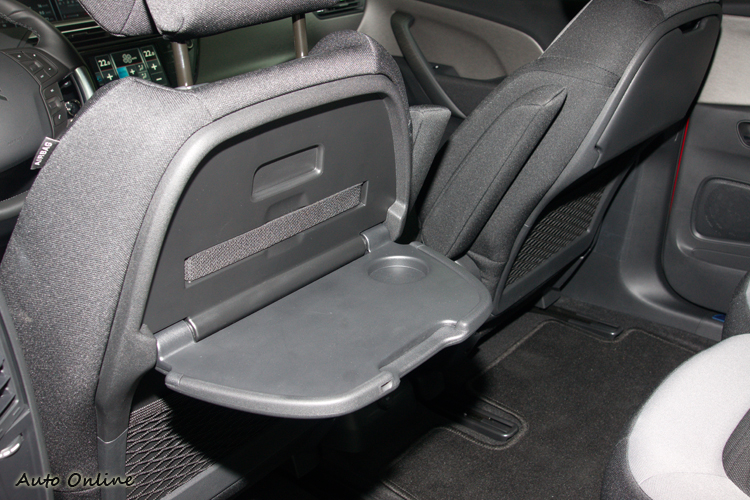 前座椅背後方有折疊餐桌,因為後排中央沒有置杯架,車門置物槽也沒有,所以摺疊餐桌上的飲料架就是放飲料杯罐的最佳選擇。