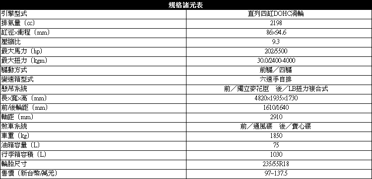 Eco Hyper動力進化![]() ▲經過進化後,所搭載的2.2L汽油渦輪引擎馬力突破200匹門檻。所謂的Eco Hyper進化並不是指換上一顆新引擎,也不是導入某單一新科技,而是針對現行2.2升汽油渦輪引擎的內部機構去做強化或重新設定。例如在空燃比設定的調整有助提升運作效率減少燃油消耗,調整引擎點火角度可改善常用速域下的油耗。 ![]() ▲下緣帶著LED日行燈的頭燈組造型立體且有科技感。![]() ▲盾形鍍鉻水箱罩有效地修飾了姿態飽滿的車頭。![]() ▲航太動力學LED尾燈。自動張力器的採用可自動調整皮帶張力並消除運轉阻力,降低引擎負擔。搭載進/排氣側雙VVT可變氣門正時系統,高效率滿足進排氣行程需求,提昇引擎工作效率。電子節溫器的搭載則會監測引擎溫度並有效控制冷卻水流的強弱,讓引擎保持在最佳工作溫度。WST賽車級金屬表面潤滑處理技術在金屬表面形成高硬度、高潤滑表層,提高機件耐磨耗強度。 ![]() ▲升級六速自排變速箱,對降低油耗也有幫助。破二百匹馬力門檻聽起來很威,不過在動力輸出的感覺與換檔邏輯設定上,其實還算是溫和的。在油門反應上需要踩重一些,多於預期的踏板深度,引擎轉速才會拉出將加速力道逐漸帶出。 ![]() ▲235/55R18尺碼配胎搭配渦輪旋翼造型鋁圈。
