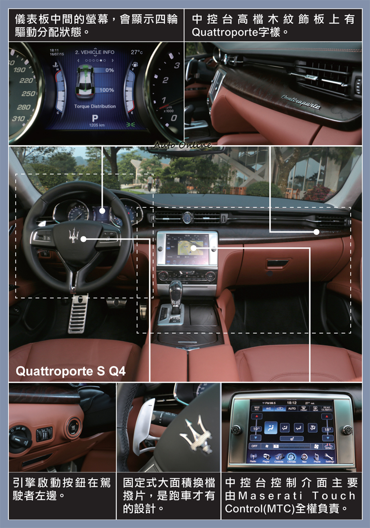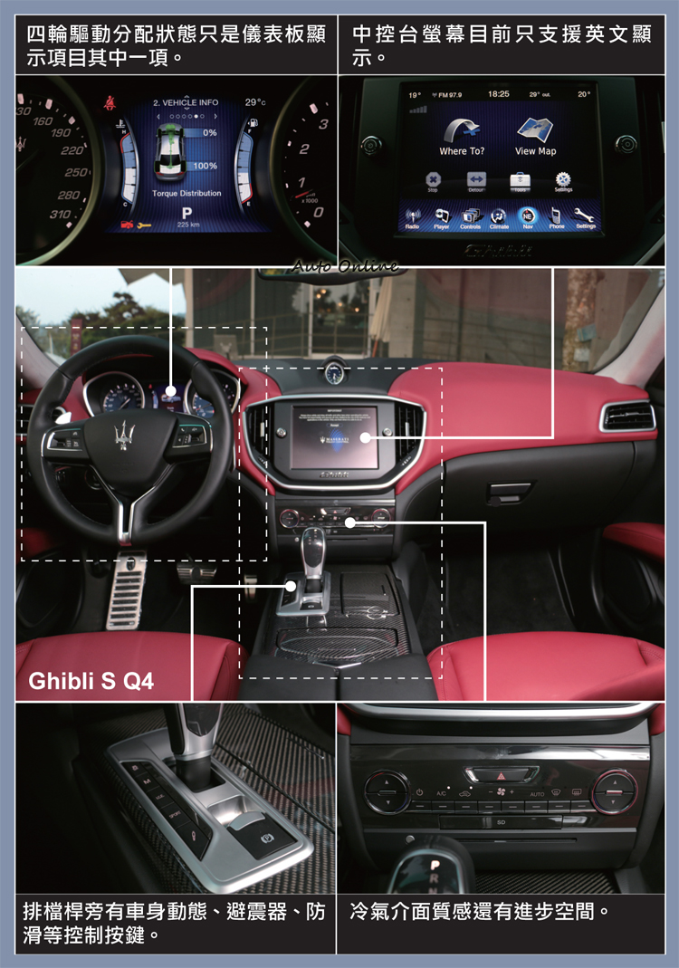 中控台控制介面主要由Maserati Touch Control(MTC)全權負責,音響、導航、空調等觸控螢幕就能調整,不過介面英文顯示,英文程度不好的需要時間學習。