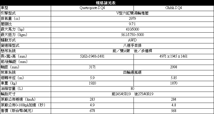 動力配置Quattroporte S Q4 & Ghibli S Q4搭載相同3.0升V型6汽缸雙渦輪增壓引擎,S Q4版本經過調校後動力比起一般版本強,最大馬力提升至410hp/5500rpm(一般車型330hp)以及最大扭力56.1kgm/1750rpm(一般車型51.0kgm),變速箱同為8速手自排變速箱。車名後方的S Q4,S代表性能版本,Q4則是四輪傳動代號,Quattroporte S Q4 & Ghibli S Q4同使用Maserati智慧型四輪傳動系統,電腦會自動分配前後輪動力,可前後0:100到前後50:50之間調整。底盤部分與一般車型相同,前採雙A臂、後五連桿設計,搭配主動式懸吊阻尼,不同行車模式下調整適合阻尼,能同時擁有豪華車該有的舒適性。