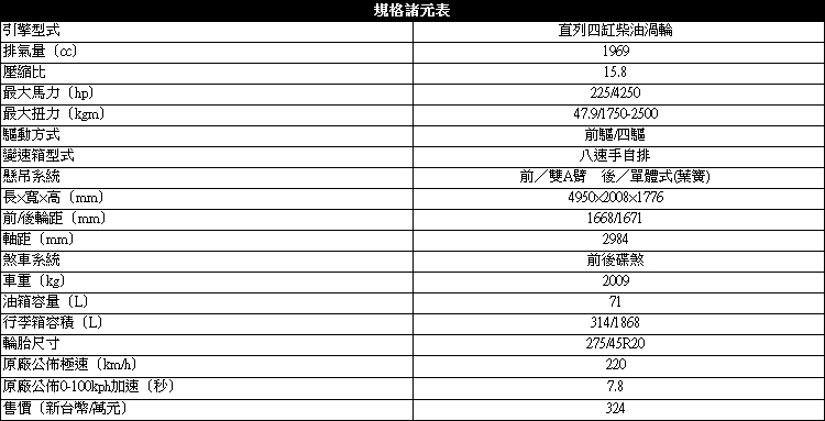 這次試駕的D5 Momentum+可輸出225hp/4250rpm最大馬力與47.9kgm/1750-2500rpm最大扭力,搭配Geartronic八速手自排變速箱,原廠平均油耗測試數據17.2km/l。