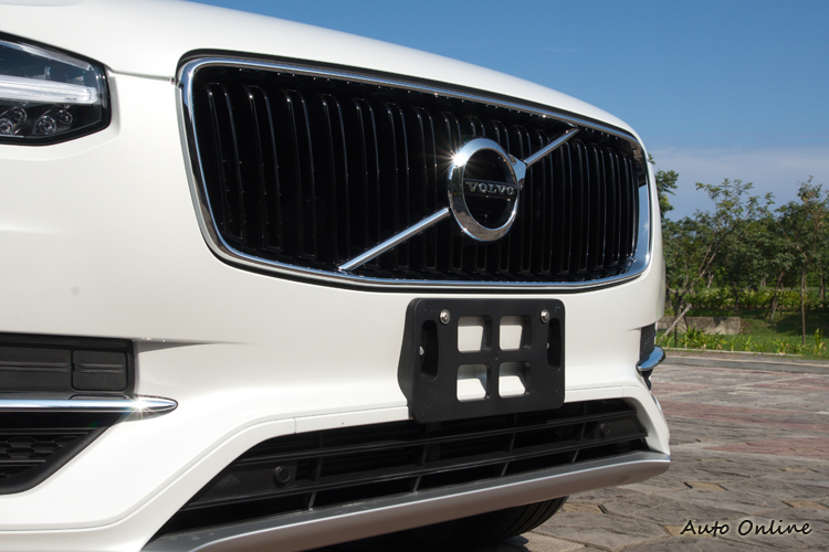 車身的方正調性從垂直的車頭前緣開始,中央的亮黑直柵鍍鉻外框水箱罩也是長方形輪廓且比初代水箱罩面積更大,頭燈下方多出了大型進氣口,銀色下護板延伸至車頭的程度則沒有像初代那麼多,更明顯的平衡感與「大塊」感強化了新XC90面容的氣勢。