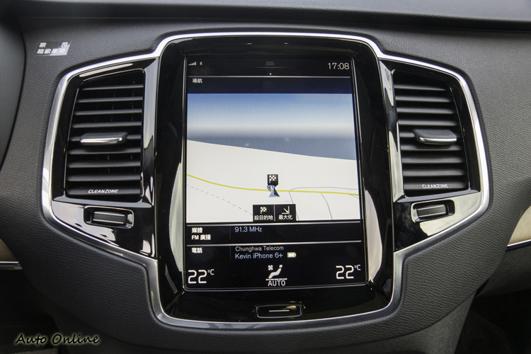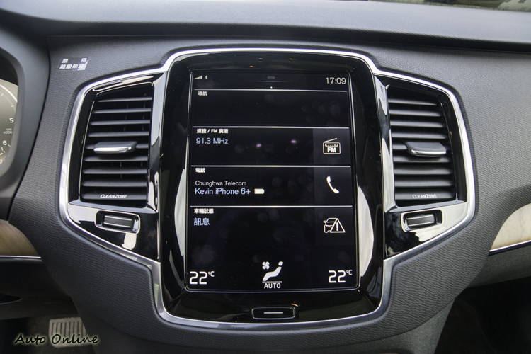有如平板電腦一般的中控台9吋觸控螢幕介面/圖形設計也很簡單,首頁就只有導航、媒體、電話、車輛四個功能項目加上下方的空調資訊顯示,操作起來不會眼花撩亂還蠻直覺,螢幕抗反光性也佳。觸控螢幕是用紅外線薄膜觸控技術,所以手指其實只要極為接近螢幕,不用實際壓觸螢幕就可操作,這樣也讓冬天載著手套(在北歐是非常平常的事)開車時操作同樣順暢不卡。