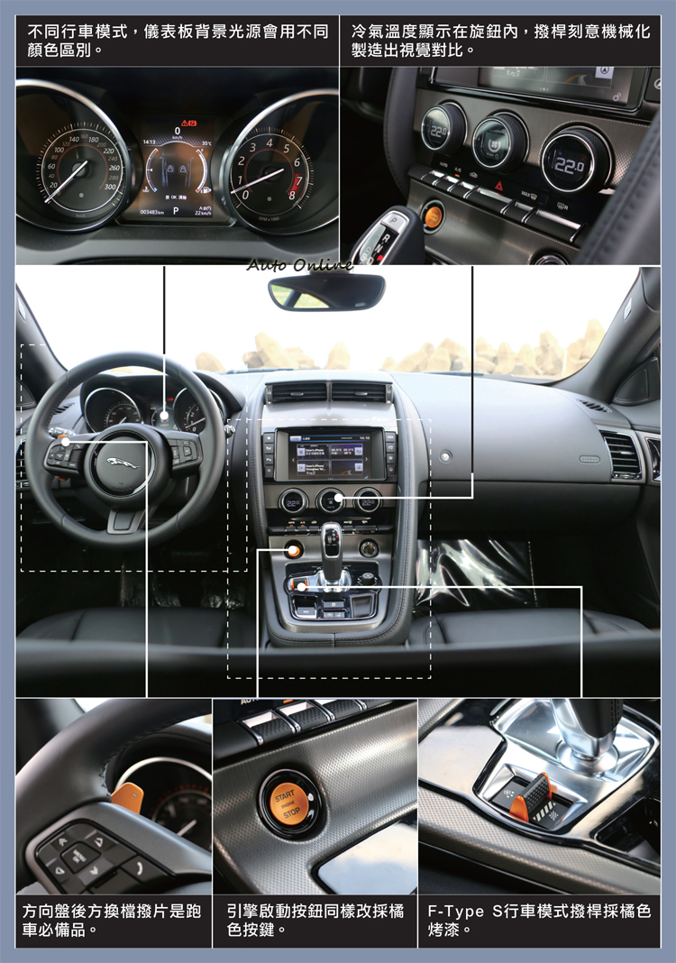 跑車新定義 有無S都很搶眼![]() ▲Jaguar F-Type S有別於以往對於跑車的設計,誰說跑車不能擁有古典扮相。Jaguar F-Type S有別於以往對於跑車的設計,誰說跑車不能擁有古典扮相,原廠刻意保留先前E-Type的影子,再加入現代車該有的科技感,我們無法斷定它這樣的設計是否成功,整天試駕過程中,看見路人反應,可判定F-Type S有著搶眼吸睛外表。坐進F-Type S駕駛座,當你要認真試探它的底線,最好做足萬全準備,因為它比F-Type一般版本還不好對付,帶給你的境界不是你能想像。多變的個性取決於駕駛如何對它,想要優雅在市區道路上閒逛,享受路人矚目的焦點,它能作為你身上的潮牌。今天心情比較不好,想藉由狂奔來發洩,要直線或者山路就看你手上的方向盤帶領,唯一要叮嚀,切記擁有過滿的自信,因為它的底線不容許你輕易挑釁。