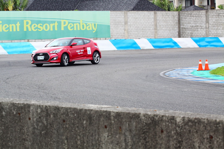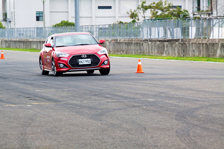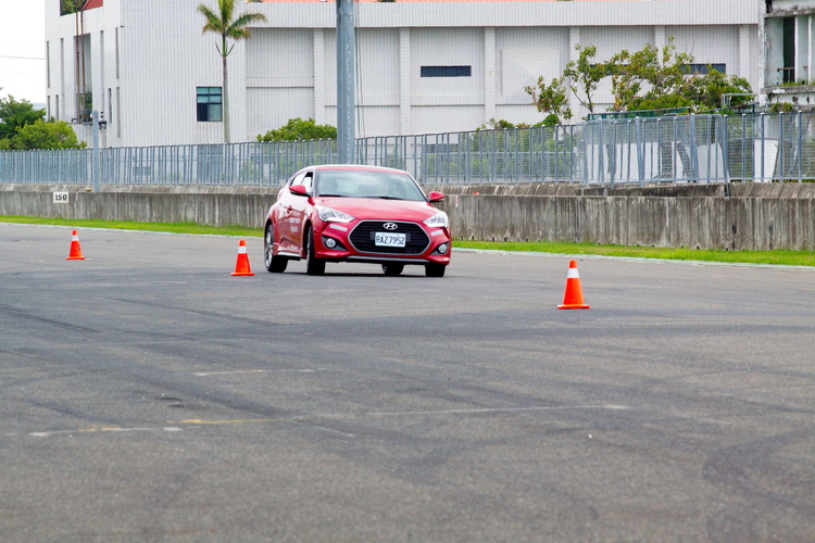 第四項關卡同樣是以一個小賽段來進行正、逆向的來回,不過這個賽段的重點就是其中算全大鵬灣賽道中最低速的彎。雖然速度低但其實更考驗車子從直路進入時車速的掌控、煞車點的判斷/煞車程度控制與轉向的控制,新Veloster Turbo在急制動帶出高G值負荷之下,車身與輪胎的循跡支撐表現也很不錯,試駕車所配的胎為普利司通RE030(與市售車配胎不同),在抓地循跡上也有加分功效。