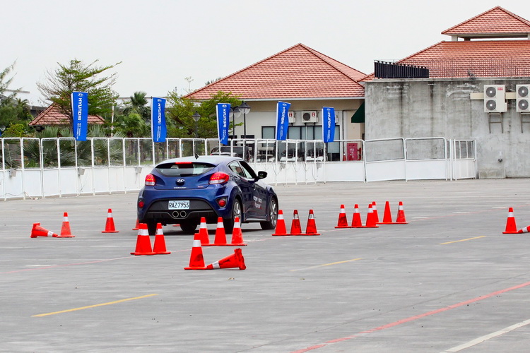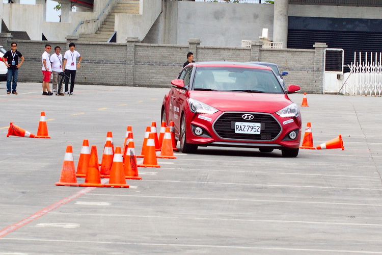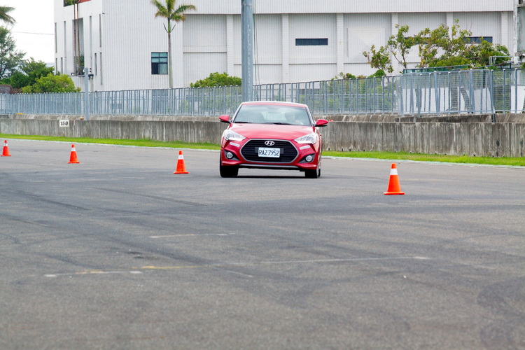 第二項關卡則是慣例的繞錐,不過三角錐間的距離是從一開始的35公尺,然後30公尺...逐漸縮短,所以在進行時因為有間隔距離的變化所以越到後面越要小心注意煞車與油門的控制,新Veloster Turbo的繞錐動態特性大致來說是循跡穩定有餘而轉向犀利不明顯,不錯的車身剛性與前:獨立麥花臣、後:CTBA歐化樑懸吊設定所具有的優異循跡能力,抑制了車身側傾、偏擺的現象,不過如果轉向角度較大造成車尾偏擺的話,要修正消弭偏擺幅度也比較花時間。