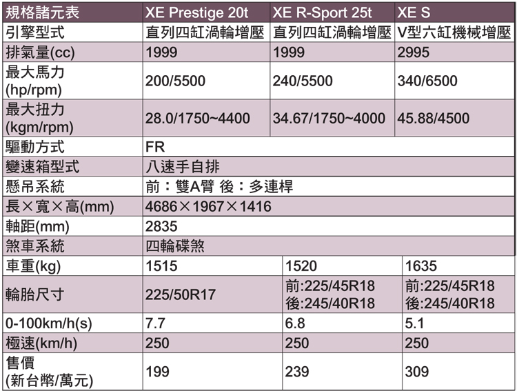 接下來換開XE R-Sport 25t,引擎使用2.0升直列四缸渦輪增壓系統,最大馬力240hp/5500rpm、最大扭力34.67kgm/1750~4000rpm,離開PIT區未進入賽道前已感受到與XE S的差異,進入賽道感受更加明顯。大直線上XE 25t加速快但稱不上猛,排氣管聲浪低調許多,直線底與XE S相差20km/h左右的速度。進入彎中明顯發覺出XE 25t懸吊以舒適性為主,側傾明顯卻不至於軟腳。TVbB煞車控制扭力轉換系統輔佐下,兩者在彎中的平均速度差異不到,反而四缸引擎的XE 25t,車頭重量較輕量,轉向比起XE S靈活、輕盈。XE 25t靜止加速到100km/h花費6.8秒,極速同樣設定在250km/h,如果不是非熱血不可的駕駛,XE R-Sport 25t非常夠用。