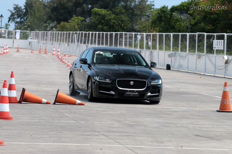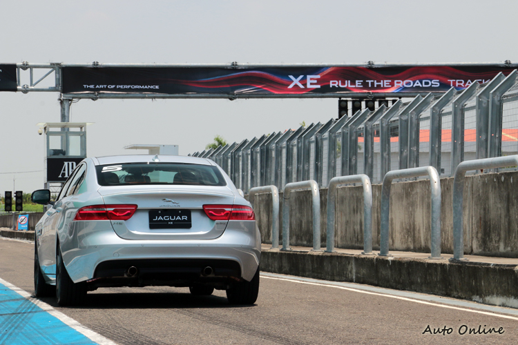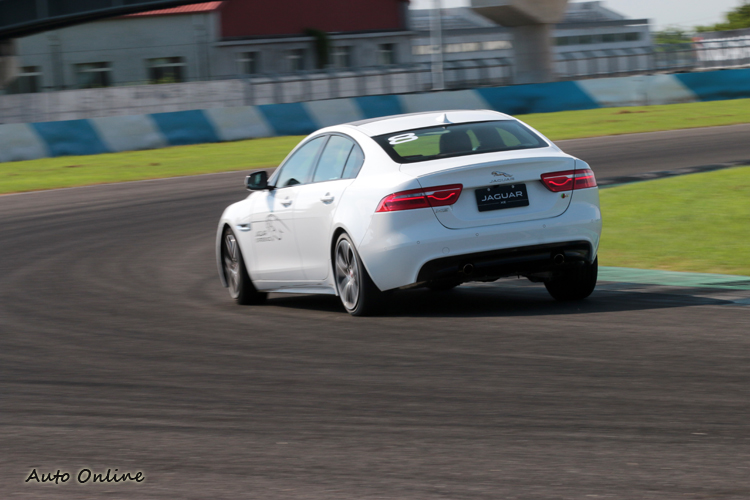 進入賽道後,隨著熟悉漸漸加快車速。V6機械增壓引擎力道無可挑剔,不管是在低速、中速或者高速,動力輸出與油門間零距離,隨傳隨到的無時差。高轉速刻意調校的排氣聲浪,低沉、雄偉與英式豪華品味的Jaguar有些不搭嘎。適應車輛與場地後,用盡全力跑一圈測試一下這輛四門跑車。高速進大鵬灣一號與二號彎,能感受出XE的車身些微側傾,懸吊保有該有的舒適,彎中刻意再加重油門,輪胎發聲抗議TVbB煞車控制扭力轉換系統還不會介入,直到超過動態極限循跡系統介入,透過制動跟扭力控制,車尾出現些微轉向過度硬是把車頭拉進彎中。XE的循跡系統介入時機與其它車款不同,較晚的介入及帶有轉向過度的反應,表現出XE在駕駛樂趣上的不同見解。