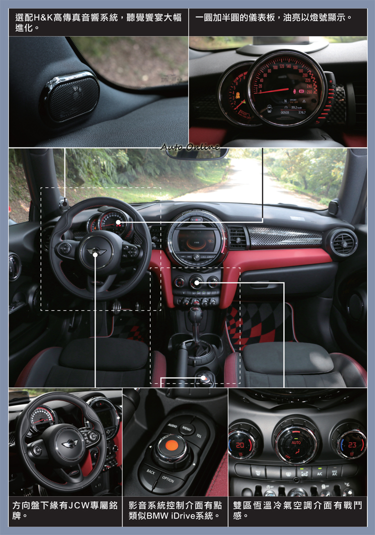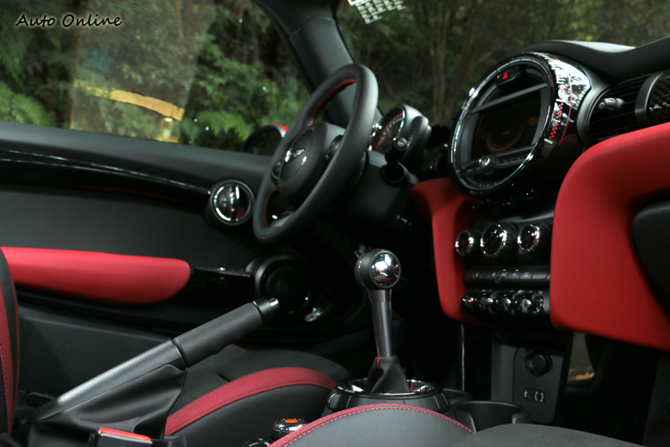 放大MINI不減山道風采![]() ▲行車模式有SPORT、MIN、GREEN三種。全新世代的MINI,車身尺寸因應潮流放大,導致很多MINI車主覺得MINI不再是以前的MINI,開起來的感覺有點走味;但試駕MINI JCW後,我覺得經過原廠廚師的重新調味,這盤菜又回到該有的味道。山路上彎道穿梭,完全電子式的方向機,不會介入太多,造就精準車頭轉向;懸吊跟Cooper S比起來,有著更清晰的路感,車身側傾也比Cooper S還要小。配上231hp與35.7kgm強勁動力,與六速手排設定,進彎、出彎一氣呵成,絕不拖泥帶水,排檔行程明確,離合器踏板輕重適中,而且現在的手排車非常聰明,降檔會自動幫你補油,駕駛無需使用跟指,就能與賽車手相同的流暢度(如果在關閉防滑系統,會取消自動補油功能)。 ![]() ▲過長的六速手排排檔桿,有點與內裝氛圍格格不入。![]() ▲火紅的引擎啟動按鈕,搭配一體式多功能鑰匙使用。