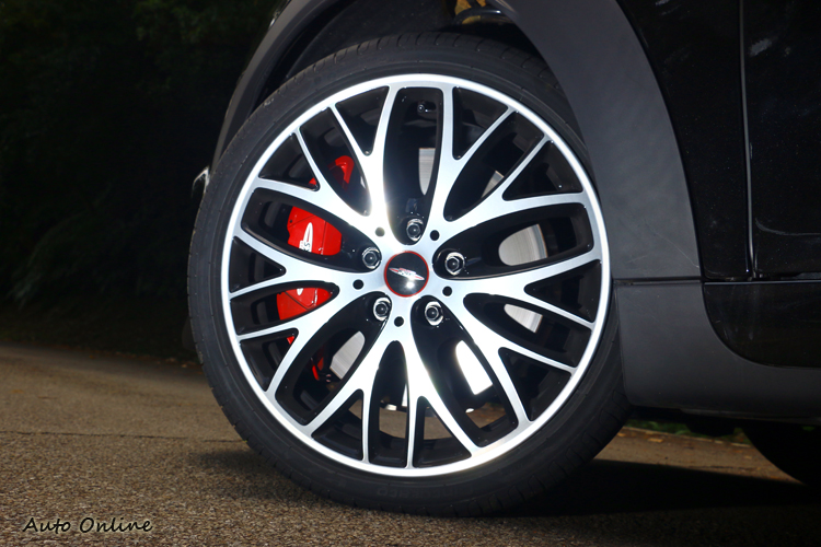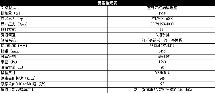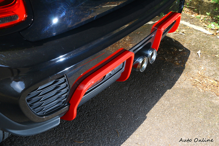 動力最佳平衡點![]() ▲MINI JCW動力從上一代的1.6L升級到2.0L,直列四缸渦輪增壓最大馬力231hp與最大扭力35.7kgm。MINI JCW動力從上一代的1.6L升級到2.0L,直列四缸渦輪增壓最大馬力從Cooper S的192hp升級到231hp/5200~6000rpm,而最大扭力28.6kgm一舉勁升到35.7kgm/1250~4800rpm,引擎代號B48B20O0與Cooper S的B48B20M0有所不同。變速箱部分採傳統六速手排變速箱,內部齒比與Cooper S只有一、二檔相同,三到六檔齒比縮小,終傳齒比放大,應該是因應馬力提升後的改變。靜止加速到100km/h需6.3秒,自排只需要6.1秒,再過幾年,不知道手排MINI會不會在市場上消失。 ![]() ▲中出雙管排氣管,選配鍍鉻尾飾管與後保桿下飾板。![]() ▲JCW高性能煞車卡鉗提供精準的制動性,選配JCW雙色18吋造型鋁圈。