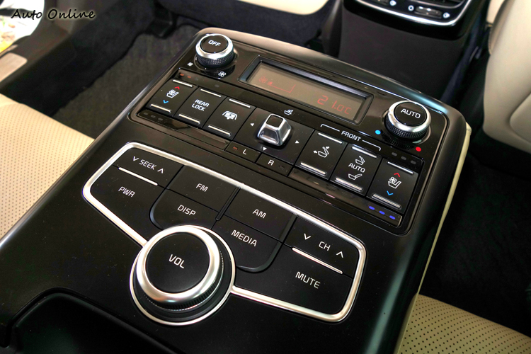 翻下中央扶手,還會發現後座有專屬面板能自己調整恆溫空調,或選擇喜愛的音樂和電台,同時也和前座一樣,座椅都有冷暖空調的功能,還外加電動氣簾式腰靠調整。而在右後方的「老闆位」,則有One Touch一鍵放倒副手座的按鍵,前座會自動挪移到最前面,盡可能讓出最大的空間給後座腿部伸展,而且只需按個鍵舊能自動復位。