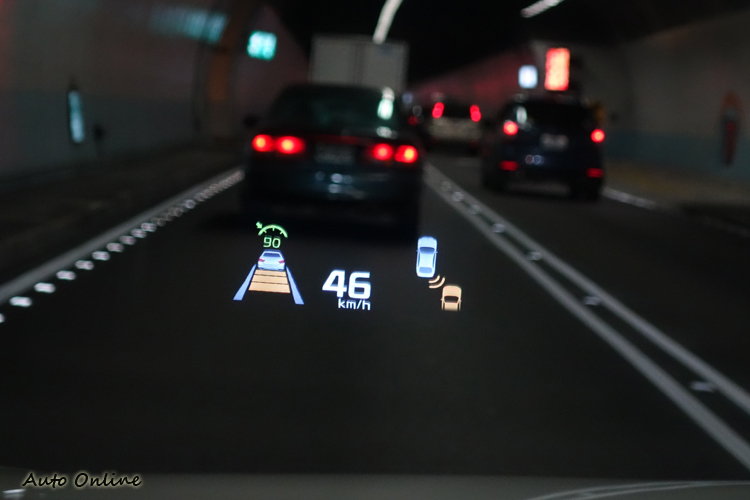 ▲全彩HUD能夠顯示巡航系統的資訊,BSD盲點偵測系統也會適時提醒駕駛注意。