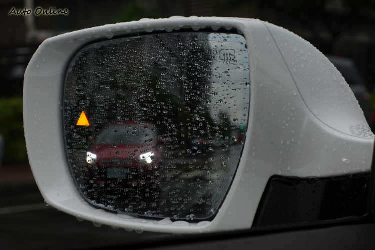 ▲後視鏡上也有BSD盲點偵測系統的燈號提醒,倘若硬要切過去還會發出警告聲。