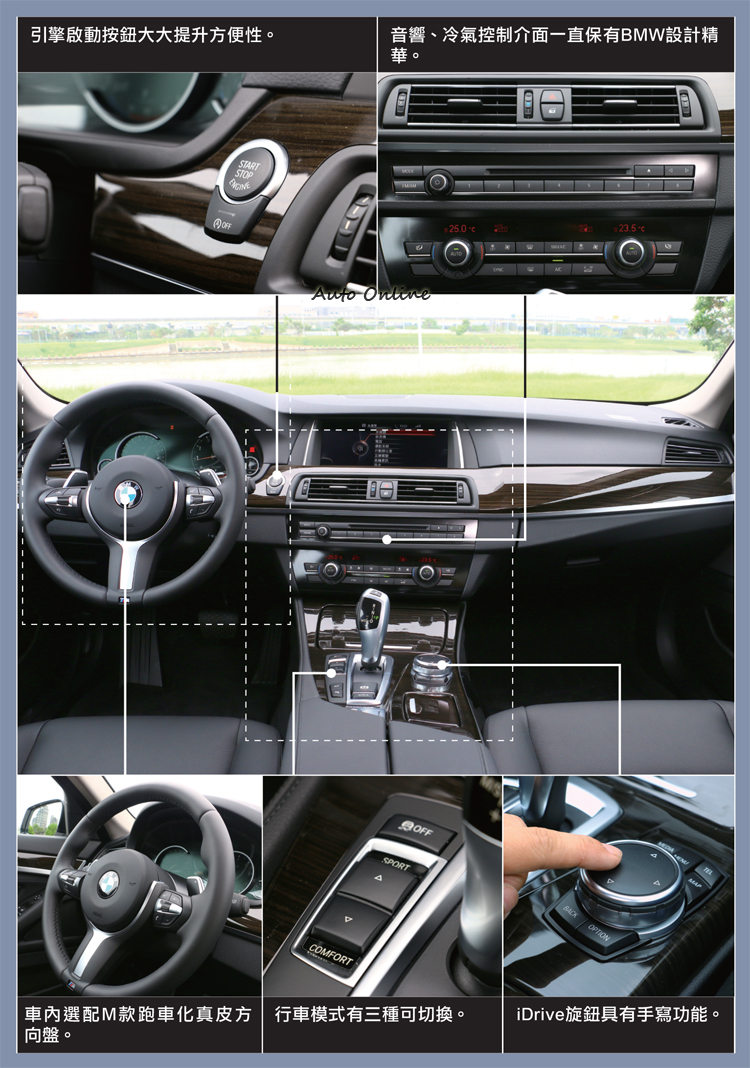 坐進到車內,520i M Sport Edition最顯目差異換上M款跑車式多功能方向盤,尺寸較小,後方有大面積換檔撥片,增添座艙熱血氛圍。特仕車上除方向盤外,高規車型才有的iDrive手寫觸控面板、中文衛星導航已列為標準配備;