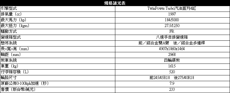 ▲搭載一顆2.0升直列四缸渦輪增壓引擎,創造出最大馬力184hp/5000rpm與最大扭力27.5kgm/1250rpm。