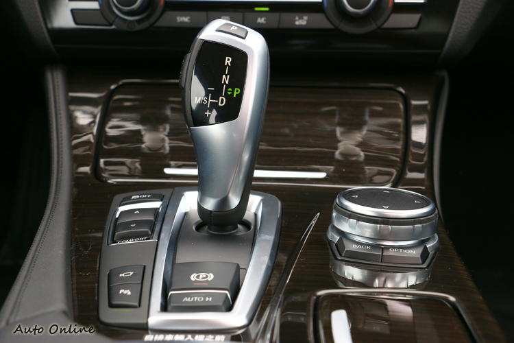 ▲中央鞍座是全車控制介面集中處,包含排檔桿、行車模式切換、iDrive旋鈕等。