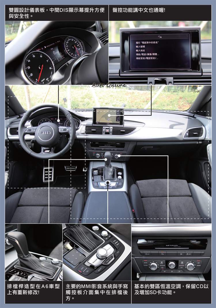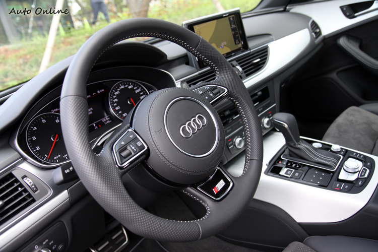 內裝鋪陳格局上與之前試駕過的35 TFSI相同,大量運用Aluminium delta silver鋁合金飾件加以妝點,鋁合金出風口旋鈕、座椅調整鈕、後門煙灰缸和行李廂開關、具有更精緻外觀與觸感細緻的鋁合金塗裝MMI控制介面以及鋁合金門檻踏板等,而全新設計的排檔桿不僅十分符合人體工學,也提供駕駛者絕佳的舒適握感,搭配質感不俗的全車真皮套件。