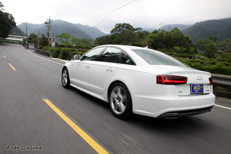 傳動部分,A6 Sedan 40 TFSI並沒有搭載Audi自豪的quattro四輪傳動系統,只有配置前輪驅動,對操控表現有小小的影響。信義區出發到北海岸這段路程,沿路經過高速公路以及濱海公路,偏向高速以及幅度不大的彎,A6 40 TFSI占盡優勢,一般的消費者也很難察覺用的是二驅還是四驅系統。但是回程走陽金公路,就得不到任何便宜,而且電子式機械動力轉向系統,有種奇怪的駕馭感覺,入彎前的第一下轉動方向盤,會覺得車頭指向慢了一點,車速越快感覺越明顯,這並不攸關轉向不足或者轉向過度,純粹是轉動方向盤瞬間與車頭指向的協調性。
