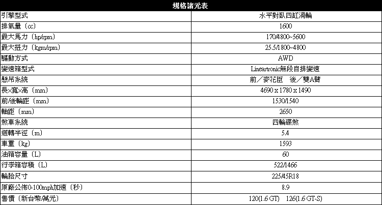原廠表示為了符合國人需求,只有進1.6升缸內直噴渦輪引擎,日本市場有的2.0升渦輪引擎未導入台灣。原廠代號FB16的1.6升缸內直噴水平對臥渦輪增壓引擎,可發揮出170hp最大馬力,引擎轉速1800rpm開始陸續產生25.5kgm最大扭力並且長久持續維持著高扭力輸出,透過跟WRX相同的Lineartronic無段自排變速箱,能有輕盈、流暢又帶有反應性的駕馭感。再加上SAWD對稱是全時四輪驅動系統及前麥花臣、後雙A臂的懸吊設定,讓駕駛者擁有人車合一的極致操控與扎實駕駛體驗。恩,說完了原廠原廠對於引擎動力的敘述,來看看在真實的世界裡是否真有此感覺。