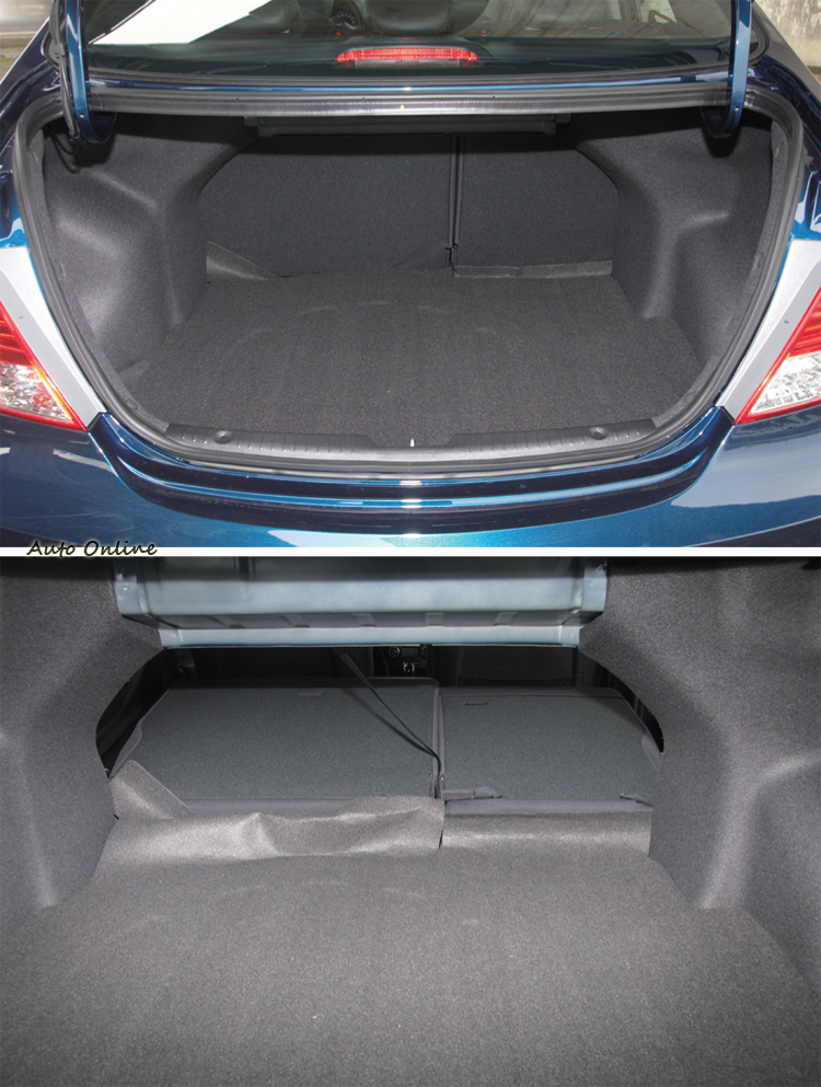 座椅方面以Verna這種價位的小型車來說,電動調整功能自然比較難以奢求,不過Verna全車系均有手動高低調整功能,尊爵型以上車型使用皮革材質包覆,且頭枕高低可調,後座椅背為6:4分離可倒。
