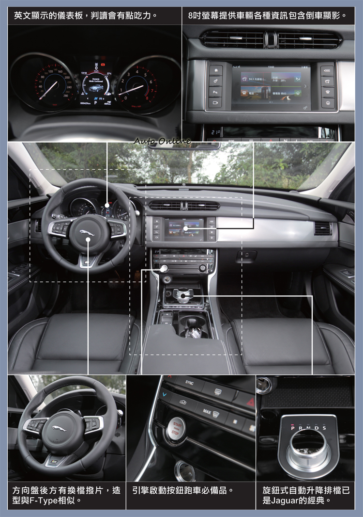 進到XF車內,可以感受到獨特的英式氛圍,每一個線條、飾板、材質都像出自於工匠之手,有如藝術品般的呈現在大家眼前,別於德系只強調科技感的斯巴達風格。