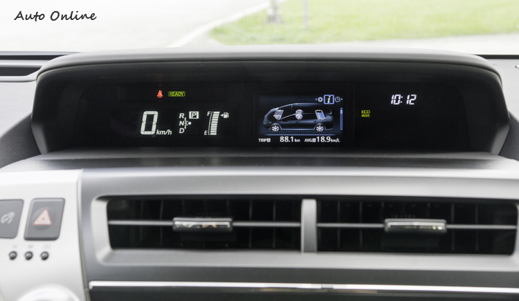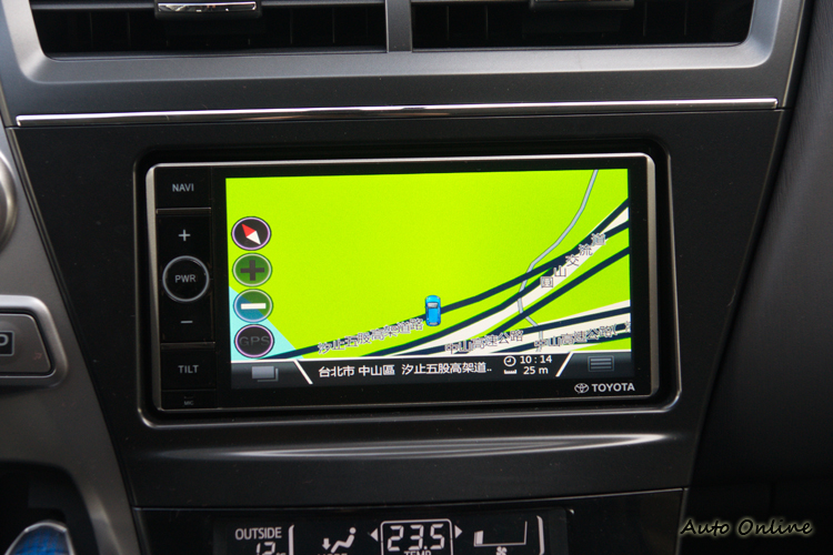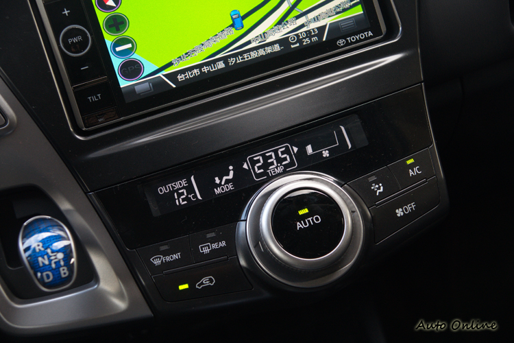 七吋AVN主機![]() 簡潔明瞭的駕駛介面應該是進入Priusα車室之後所給人的印象,大部分的操作與功能顯示都是集中在中控台上,方向盤前方沒有儀錶組,而是在中控台上方的MID多功能行車資訊顯示幕來顯示車速、燃油剩餘量、(引擎、馬達)動力傳輸示意、里程數等行車資訊。如果不習慣視線要一直往旁邊移也沒關係,方向盤前的抬頭顯示器會把最常需要判讀的「車速」資訊投射在前擋風玻璃上。 ![]() ▲行車資訊都臂移至中控台上方來顯示。![]() ▲原廠觸控式衛星導航系統。![]() ▲旋鈕操作的單區恆溫空調系統。