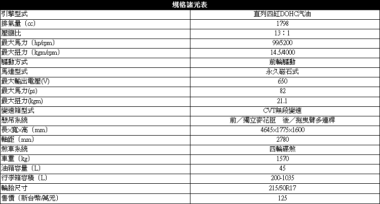與Prius相同的混合動力系統設定![]() ▲動力上搭載與Prius相同的THS油電混合動力系統。雖是Prius家族中身材較大的兄長,Prius α在動力上仍是與Prius採用相同的配置,搭載由一具1.8升排氣量Atkinson循環式引擎搭配永久磁石式馬達所組成的THS油電混合動力系統。 ![]() ▲變速系統為E-CVT無段變速箱。![]() ▲系統提供純電行駛以及引擎為主馬達為輔的ECO節能與Power模式。即使是解除「ECO」,老實說這部車仍然給筆者一部類似在開1.3L汽油引擎車的感覺,油門快踩到一半,加速感才姍姍捎來問候,車子在應付山路爬坡之類的情況並不顯得掙扎,不過加速的曲線實在很緩,即使是切到「Power」模式也只能聽到引擎多拉高一點的轉速聲浪。在下坡時,可以將排檔桿切到「B」檔位來讓系統回生動力,與過去筆者所試過的Outlander相比,B檔位下比較沒有那麼明顯的「減速感」,讓原本想靠B檔發揮類似「檔煞」的期待小小落空。 跟Prius一樣,對於大部分買此車的消費者來說,油耗才是它的首要重點,性能表現上完全守在不超過「順順開」的界線之內,換來的是20.0km/l的油耗測試數據(低風阻的外型對高速油耗也有幫助),就算是經常跑長途也不用為需要頻繁地找加油站而煩惱。
