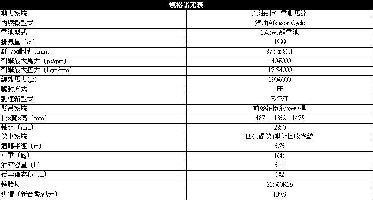 ![]() ▲Hybrid車型同樣配備LED頭燈和遠近燈自動切換功能。![]() ▲雙螢幕儀錶提供的資訊不少,雖然沒有中文顯示,但圖示一點都不會艱澀難懂,不小心晃神還會請你喝咖啡。![]() ▲音響和空調系統的面板重新調整後,控制台看起來更清爽。![]() ▲螢幕以動畫顯示當前系統運作狀態,只可惜沒有繁體中文字型。![]() ▲唯一要抱怨的是後行李廂被電池佔用空間,原廠快想想辦法吧!