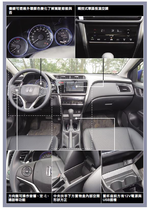 觸控式先端通訊音響系統追加導入這次改款的重點之一,就是頂規的VTi-S車型(City共有V、VTi、VTi-S三種車型規格)所配備的觸控式先端通訊音響系統。在八吋電容式全彩高畫質多點觸控螢幕中內建NAVI衛星導航系統、多媒體影音播放、支援Bluetooth藍牙通訊,並支援Wi-fi與智慧型手機等行動裝置連結,來使用多項支援行車/生活輔助APP,在影音娛樂上比較能符合現在3C族群們平常的用車需求。