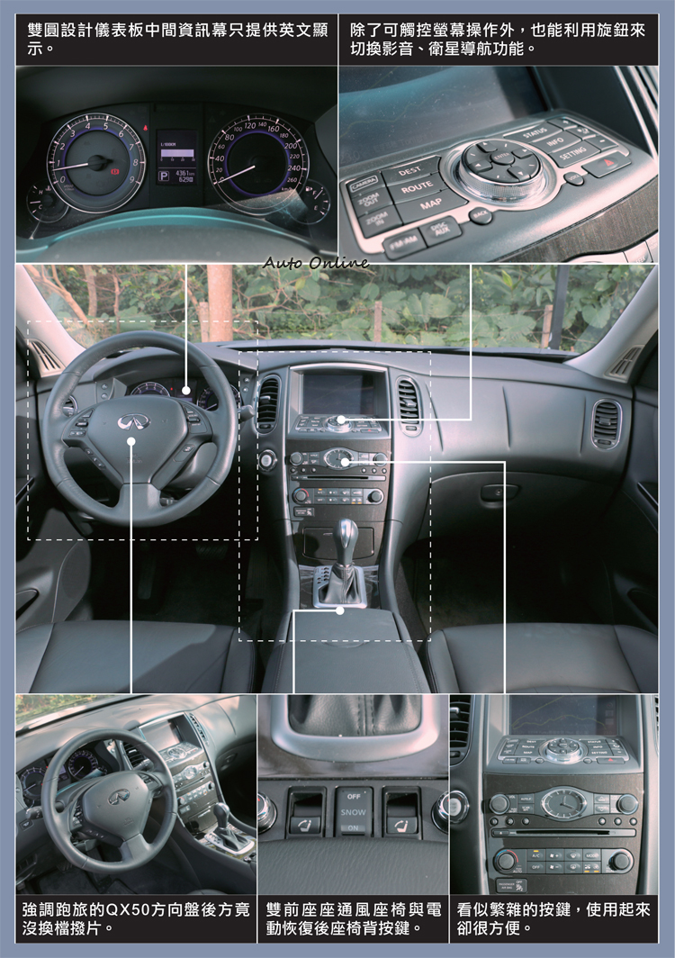 Infiniti QX50就是之前的EX37,這次小改款改走精緻風,透過前後保桿的線條修飾,整體感覺更加緊實與時尚,軸距拉長至2880mm,創造出寬敞車室空間;動力上還是維持經典VQ37VHR引擎,飽滿的加速力道增添駕駛樂趣,留著東瀛戰神之血液。煥然一新的精緻跑旅,是值得消費者細細品味它的好。