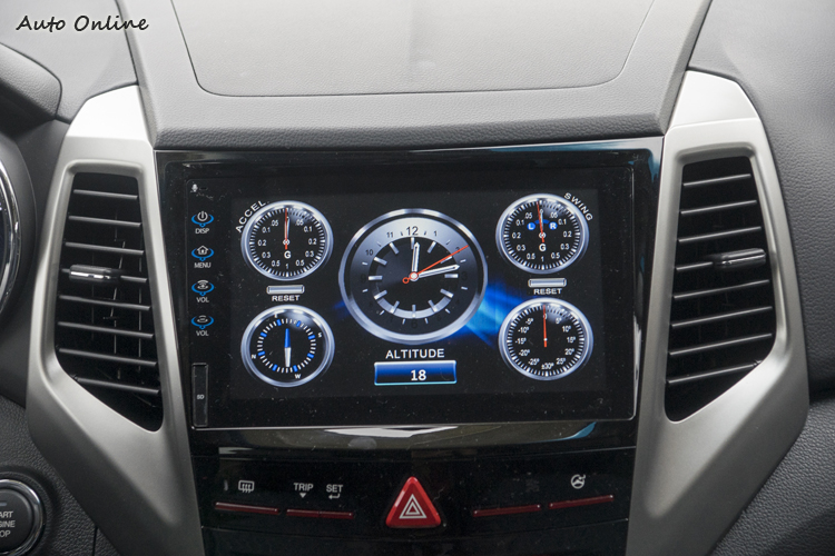▲八吋螢幕上可顯示時間、指南針、加速計、橫向G值計與車身傾斜計。