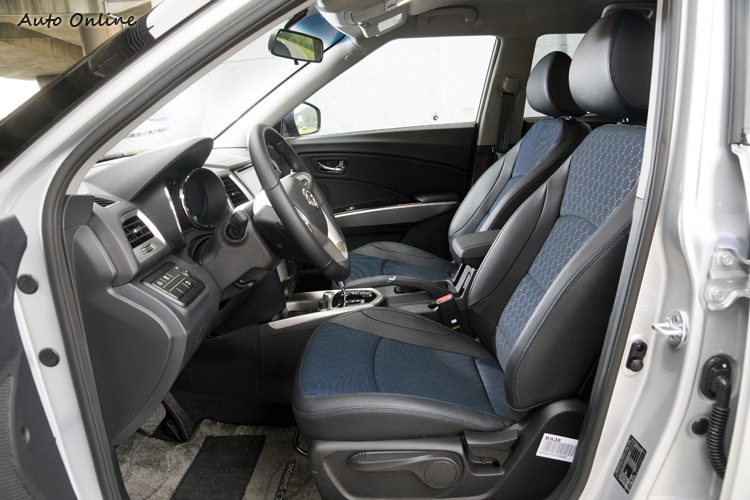 座椅為椅背、椅墊中樣藍色不織布與兩側合成皮所混搭包覆,椅背與椅墊二側都有側墊提供適度側面支撐。前座的前後或椅背傾斜調整都是手動式的,也沒有座椅高度調整功能是比較可惜的地方。