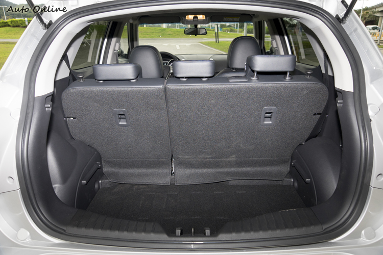 可惜椅背放倒後與行李廂底板間有段不算小的高低差,加上兩側避震塔突出的形狀對空間的影響以及尾門門檻偏高,放置/取出物品時手必須抬高等,都影響了後方行李空間的實用度。