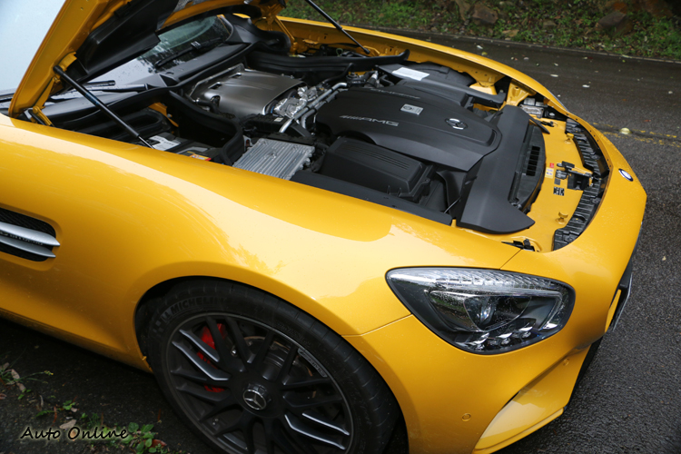 GT S另一個特點是引擎位置在前軸與車艙之間,也就是所謂的前中置引擎配置。掀開引擎蓋就能看到, 這具 M178引擎體積不小,不過還好有超長的引擎室,所以只佔據了後半部;至於前半部則留給一堆或站或躺的散熱鰭片與風扇,其中包括中冷器也是採用水冷的設計。