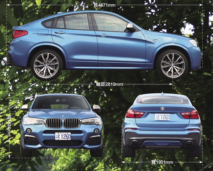 X4在外型上就像縮小版的X6,雙門跑車的流線車頂線條,較高的離地高度都是此車的特色。在M Performance調校後,外觀有專屬M款空力套件,前、後保桿與側裙都與一般車型不同;車外後視鏡、雙腎形水箱護罩以及左右兩側前進氣壩的上方邊緣皆綴有Ferric Grey銀灰色飾條特意突顯出差異性。另外,鋁圈搭配M款雙輻式680M造型,前8.5J 245/40 R20與後10J 275/35 R20規格胎圈。車身尺碼,車長4,671mm、寬1,901mm,僅1,624mm的車高讓外型更顯低平,像是升高版的4 Gran Coupé ,造就了絕佳的操控表現。