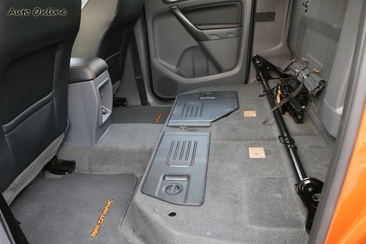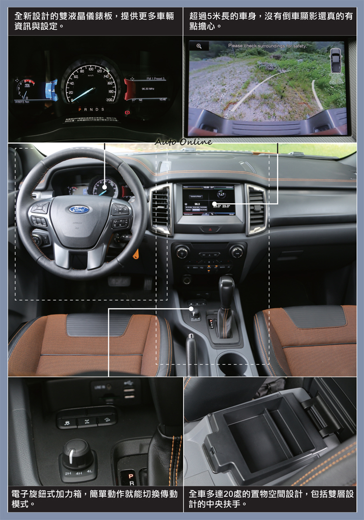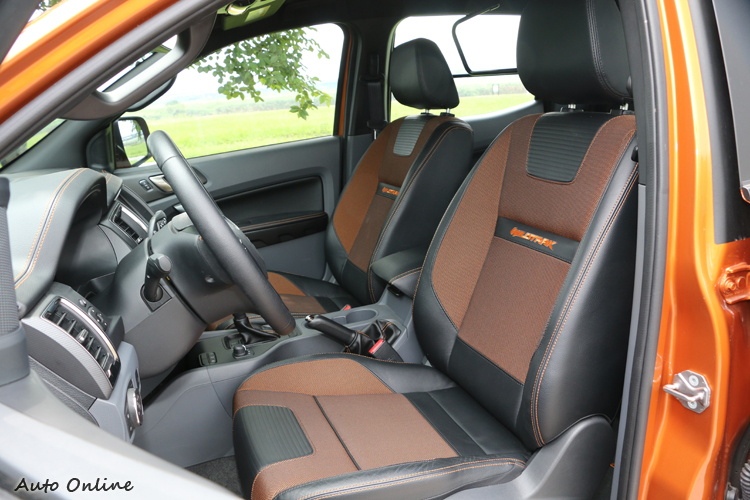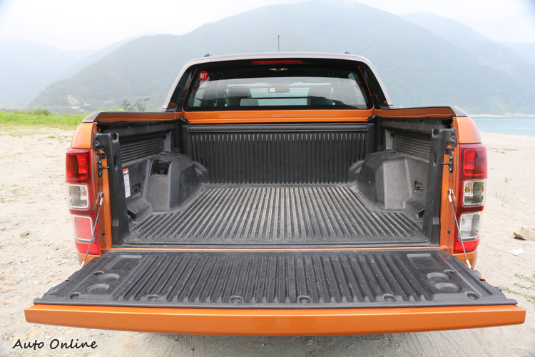 前座椅為八向電動調整,中央扶手內藏空調出風口,後方座椅在台灣無法合法使用,因此試乘車上並沒有安裝,不過後座腳踏墊、12V電源、地圖袋、車門揚聲器等,一樣都沒少。Ranger外型或許給人粗獷的印象,但車內隔音品質非常不錯,後輪即使是葉片彈簧,乘坐舒適度也不輸給一般SUV,比較不習慣的大概就是超長軸距在壓過坑洞時,兩次彈跳與悶哼聲時間差比平常習慣還長很多。