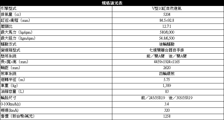 自然進氣高轉速解開封印![]() ▲靜止加速到100km/h慢了0.2秒為3.4秒,極速低了5km/h為320km/h。引擎與變速箱還是維持原本機構,七速雙離合器自手排變速箱只修改四輪驅動系統,這點對於原廠來說不是難事。引擎使用5.2升V10自然進氣引擎,搭配MPI多點噴射及IDS缸內直噴系統。為了要達到最佳動態平衡,動力小幅下修,最大馬力從原本610hp調降到580hp,爆發時機提早在8,000rpm時產生,扭力也從原57.1kgm下修至54.8kgm,輸出轉速不變。靜止加速到100km/h慢了0.2秒為3.4秒,極速低了5km/h為320km/h。