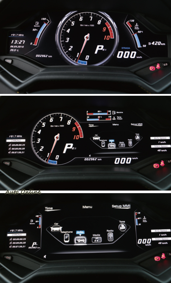 行車模式決定個性![]() ▲引擎啟動按鈕像不像戰鬥機的飛彈發射開關。令人緊張的時刻莫過於坐進Huracán LP 580-2駕駛座的剎那,操作介面不陌生適應起來很快。行車模式有Strada(一般)、Sport(運動)、Corsa(賽道)三種,切換按鍵在方向盤六點鐘位置,不同模式下,引擎、變速箱、動態穩定等會有不同個性表現。如果你對你的駕駛技術沒有把握,可先從Strada模式來摸清它的底。這模式下駕駛可以一派輕鬆,原地轉動方向盤輕盈不像是跑車該有的調性,變速箱不刻意切換換到手動模式下,電腦自動幫你選擇檔位,隨著轉速漸漸拉高,後方引擎傳來的高轉聲浪有如天籟,那種尖銳、高亢的聲響不自覺就熱血沸騰。 ![]() ▲中央鞍座上另外提供引擎溫度、油壓、電力來監控。![]() ▲駕駛者前方12.3吋液晶螢幕顯示儀表板提供車輛所有資訊。![]() ▲Anima動態切換按鈕在方向盤六點鐘位置。![]() ▲為了能有更協調的車身動態,動力小幅度下修。![]() ▲倍耐力專門為Lamborghini所設計生產的P-Zero專用胎。