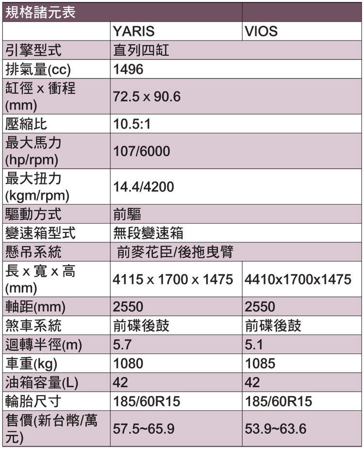 市場霸主改變有感![]() ▲YARIS價格從57.5萬元到65.9萬元,VIOS則為53.9萬元到63.6萬元,看看競品都要60萬元起跳。小改款後終於擺脫四速自排的糾纏,導入Super CVT-i無段變速系統的優勢,提供更節能的輸出表現,雖然車身造型、配備在這次改款中未多加琢磨,還是可以看出原廠誠意滿滿。不過可惜處全車系還是沒有配置循跡防滑系統,安全氣囊維持雙前座兩顆,安全部分還有很大進步空間。消費者可以想想,當動力與安全只能擇一,會選擇新引擎、變速箱呢?還是循跡防滑系統與安全氣囊。試車的過程中,不小心的發現儀表板內留有循跡控制的燈號,這會不會又是下一次小改款所埋的伏筆呢?讓我們繼續看下去。 ![]() ▲VIOS與YARIS是中、小型車系中產品主力,也是首購族或者家庭添購的首選。