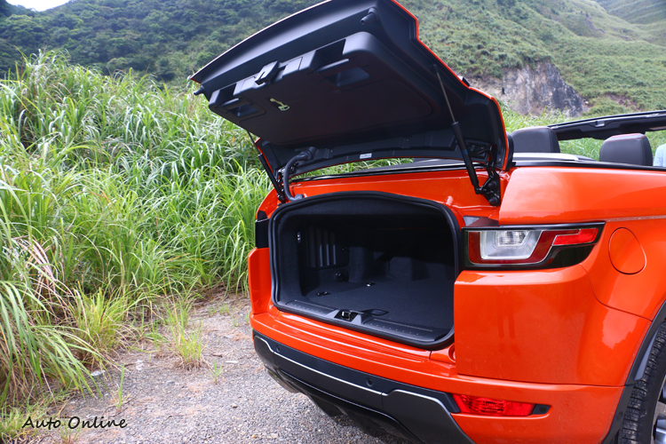 軟篷機構豪華不減![]() ▲獨特的黑色Z字型軟頂敞篷收折設計,軟蓬內裡加以隔音及隔熱強化處理。Evoque Convertible採用防水織布電動頂蓬,開關就設在中央鞍座置杯架旁,獨特的黑色Z字型軟頂敞篷收折設計,軟蓬內裡加以隔音及隔熱強化處理,可於時速48km/h以內操作,達到開啟僅需18秒、關闔21秒的速度。另外,對敞篷車型開發的全新無窗框車門結構,以簡潔俐落的設計,讓開啟頂篷時的車身比例依舊完美。 ![]() ▲收納敞篷機構空間固定,開關篷與否行李廂容量只有251公升。