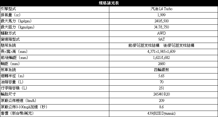 ![]() ▲高規HSE Dynamic標配全牛津真皮包覆座艙,提供5種內裝色系可選擇。![]() ▲後座椅背稍嫌過直,冷氣出風口提供舒適度,中間扶手能打開貫通行李廂靈活運用。![]() ▲10.2 吋彩色中央全觸控顯示幕,越野時提供重要資訊給予駕駛。