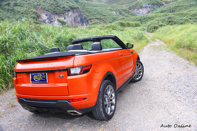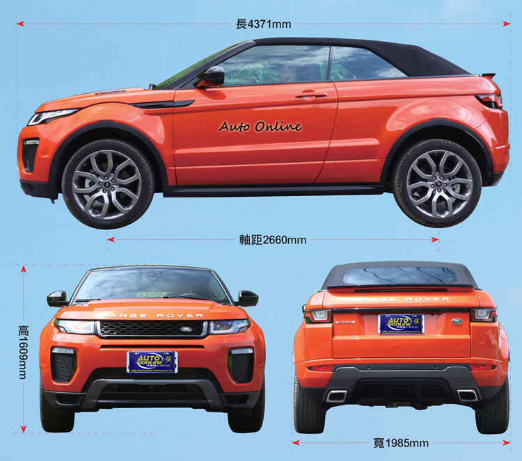 新格局新視野第一眼看到它時,覺得它應該是Evoque Coupe進化而來,原廠宣稱 Evoque Convertible耗資過50億台幣規模全新打造,我們拿出兩者的車身尺寸來比較,車長、車寬與軸距相同,都為4,371mm、1,985mm與2,660mm,只有車高部分Convertible的1,609mm及Coupe的1,635mm相差26mm而已。雖然車身尺寸相近但我相信Convertible比起Coupe車體有很多地方需加強,姑且不談車體結構從「口」變「ㄩ」需要增加的底盤強度,光是A柱必須應付翻滾時候的應力,要比Coupe車型來的強壯,所以我相信車廠可是花下重本來研發Evoque Convertible。![]() ▲車頭方正中略帶有圓潤,梯形日行燈,雙欄式前網格進氣柵,視覺上提升高度。![]() ▲飽滿的車尾加以雙出排氣尾管與倒梯形尾燈,營造優雅與狂野的危險均衡。
