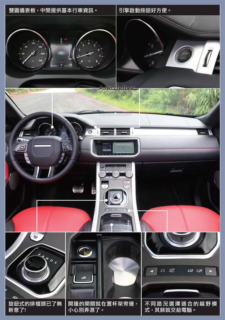 少了頂篷實力不減![]() ▲敞篷車不在只是跑車的專利。第一次開著敞篷車往產業道路裡開去,我絕對相信Land Rover的越野實力,比較不放心則是碰撞造成車體損傷。先是緩緩駛入碎石路面,可以說小菜一碟,懸吊前後都採鋁合金麥花臣,搭配長行程避震器桶身,車身雖有晃動幅度卻不大,SUV胎足以對付抓地力夠的路況,Terrain Response®還只是在一般模式而已。 ![]() ▲Evoque Convertible越野極限進入角、穿越角和離去角分別為25°、21°及31°,前軸障礙跨越高度215mm,越野障礙跨越高度255mm。![]() ▲想要重度越野,先換一組專用越野胎吧!