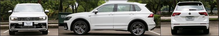 車頭設計上,和Passat或Touran一樣在引擎蓋上多加了一組V型折線,頭燈也依照等級不同會有鹵素、反射式LED或投射式LED的分別,像我們試駕的頂規R-Line,當然就是配上附有AFS轉向功能的投射式LED頭燈。R-Line同時還有專屬的logo和保桿設計,兩側進氣口會特別加上亮黑飾框,下方也會加上車身同色的飾條。附帶一提的是,雖然Tiguan骨子裡也是一款越野性能不錯的車,不過台灣引進的版本並沒有搭載越野套件,因此保桿型式配置的是進入角18度的公路版。