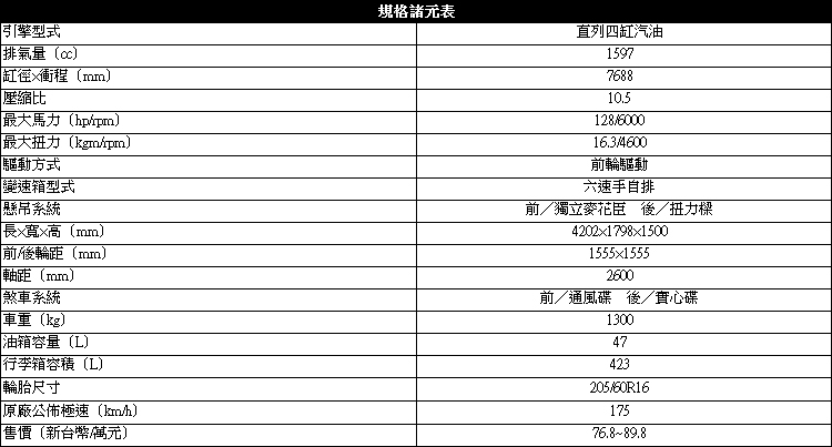 所以結果就是,低速時給人輕快的起步、加速感,而到中速並持續朝高速拉的時候加速力就會比較虛。對於都會使用來說還蠻OK,跑山路或高速道路時行路感就會比較緩和減速後再加速的動力輸出彈性也是如此。檔位間的齒比略疏也造成在檔位變換過程中的動力銜接會有些頓錯的感覺。若以1.6升自然進氣動力而言,滿足日常用車需求還OK,甚至比幾個同動力級距的對手還好,再次覺得,與日系國產車的感覺相近。